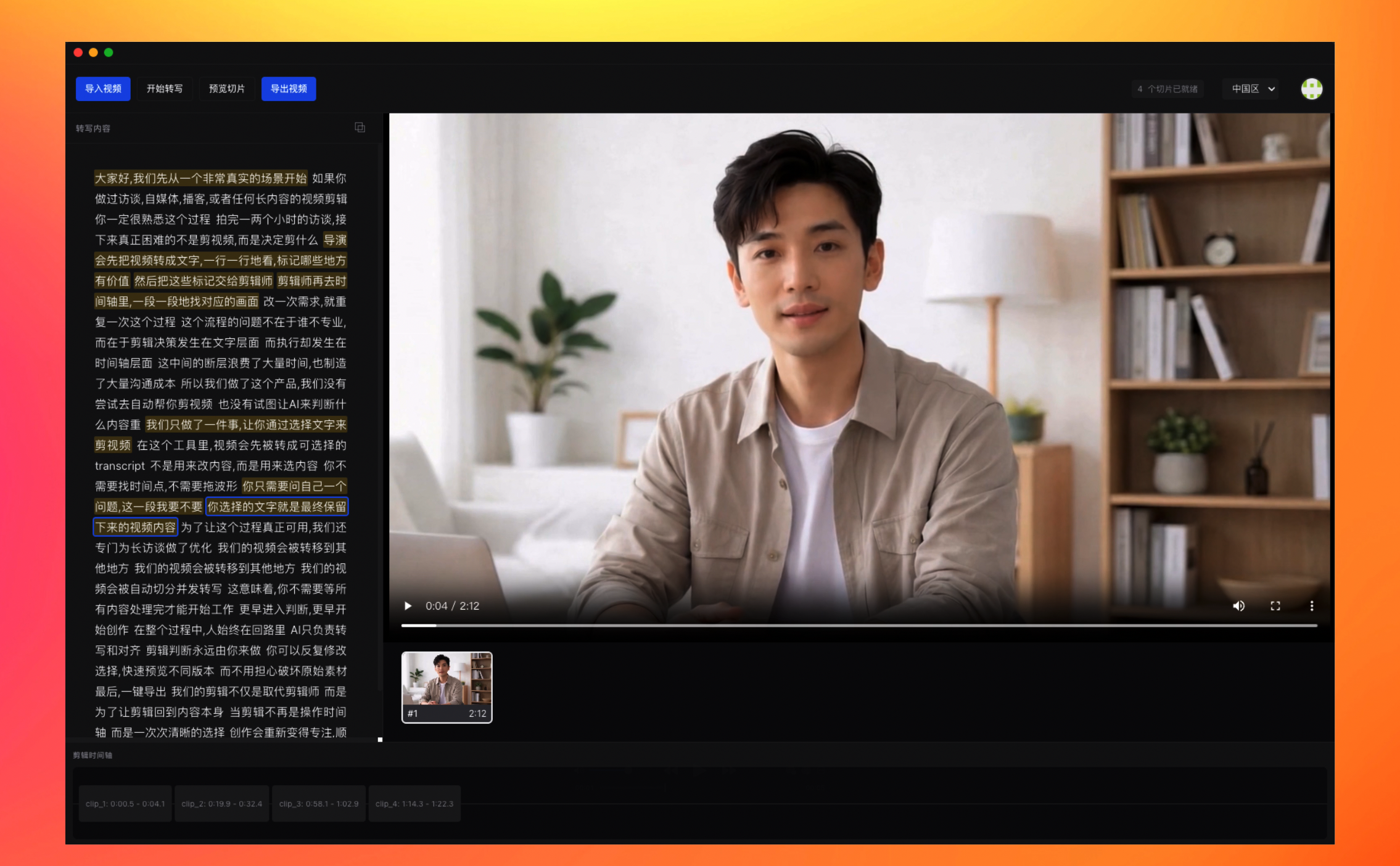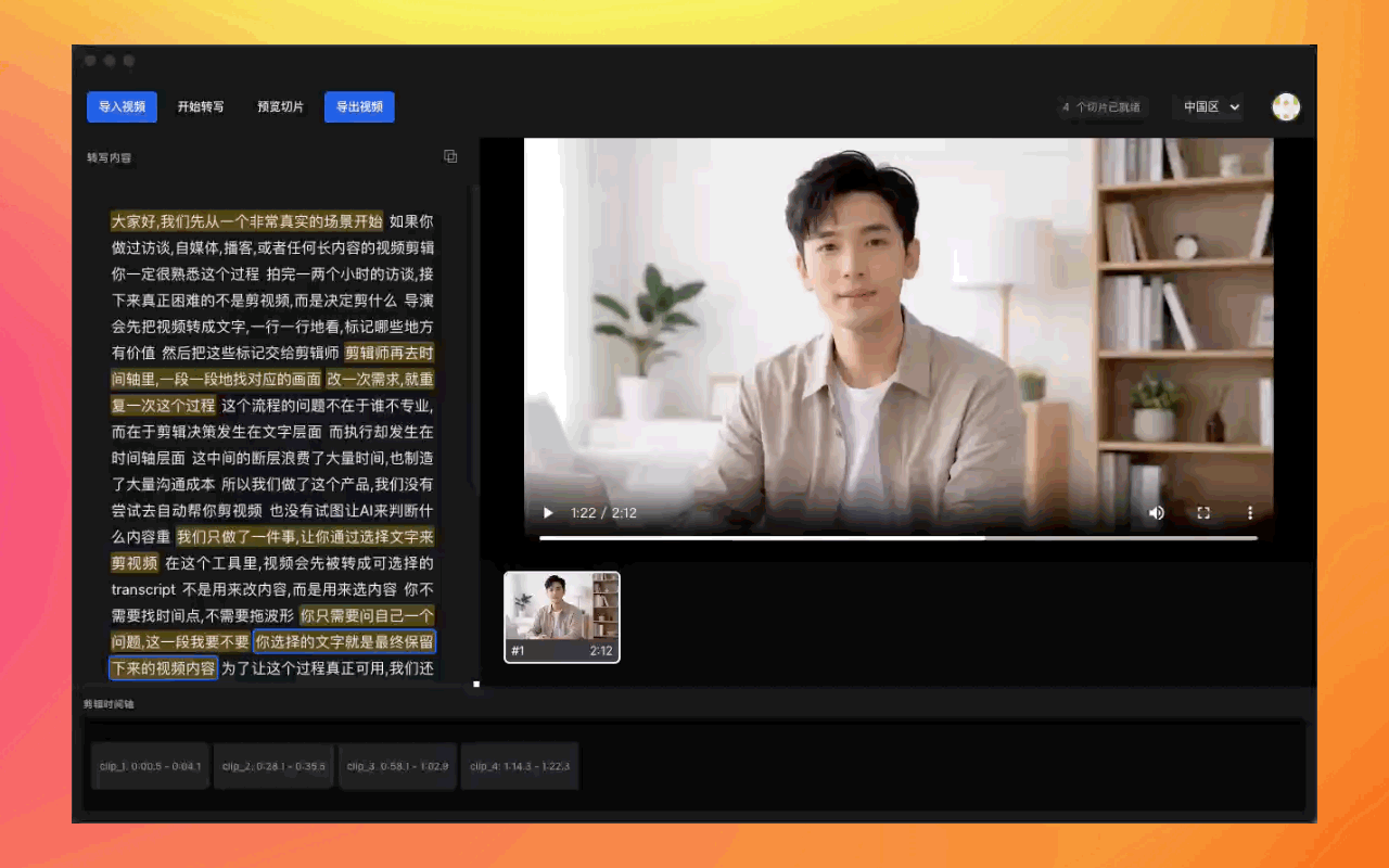 几小时的访谈视频,不再需要漫长等待。应用会自动将长音频切分,并发完成转写处理,让你更早开始选择内容。