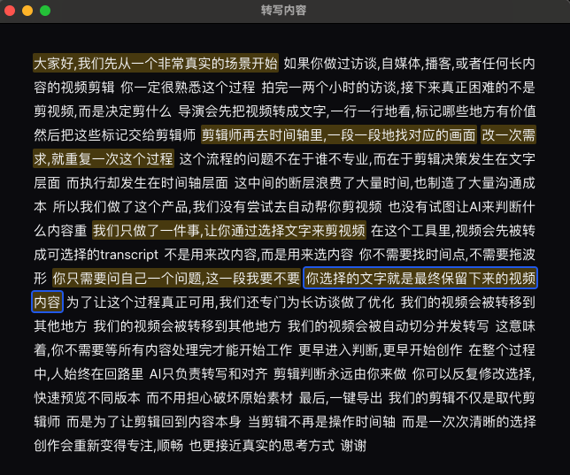传统剪辑工具要求你找时间点、拖动片段、对齐波形。在这里,视频被映射为可选择的文字。
